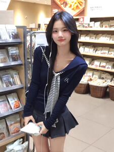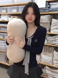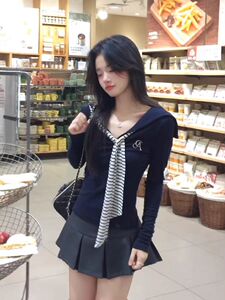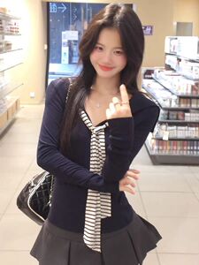 海军领长袖T恤女2025春秋新款条纹领带拼接时尚百搭收腰打底上衣