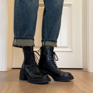 澜柜版~高跟厚底百搭气质马丁靴女软皮防水台系带侧拉链弹力短靴