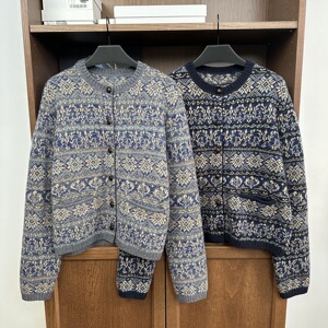 复古费尔岛深浅提花圆领皮扣针织开衫外套 2色