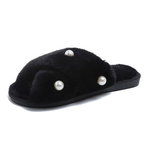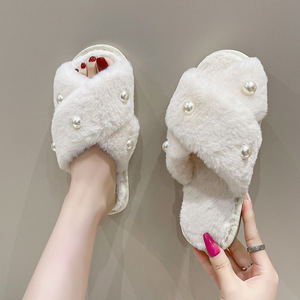 珍珠交叉毛毛拖鞋女秋冬新款休闲平底鱼嘴套脚室内外穿保暖毛拖鞋