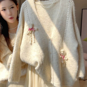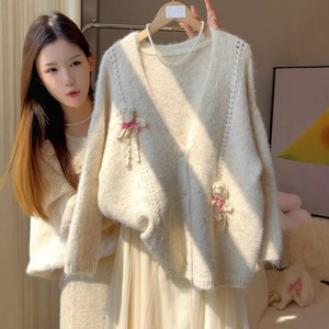 2025秋冬新款温柔风甜美清新针织开衫优雅花朵宽松百搭毛衣外套女