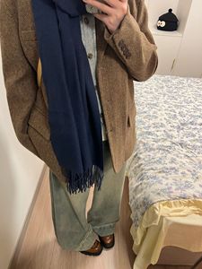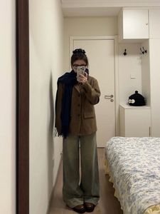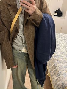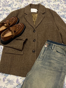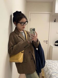 Benview【实体专供】秋冬韩版棕色羊毛呢西装外套女小个子人字纹