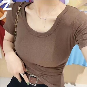 冰丝夏季新款螺纹T恤短袖女纯色U领大圆领弹力紧身显瘦百搭女短袖