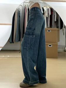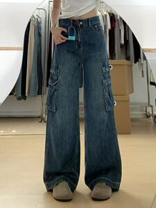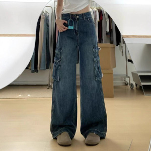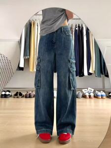 秋冬新款美式复古工装牛仔裤女高腰大码梨形身材慵懒多口袋阔腿裤