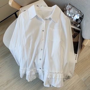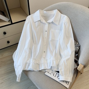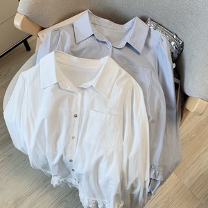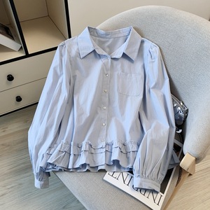 广州十三行高货爆款~蓝长袖衬衫女翻领宽松设计感木耳边蓝色衬衣