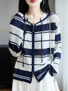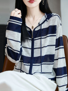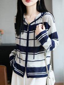 【厂家直供】春秋新款条纹连帽开衫外套女时尚宽松减龄薄外搭毛衣