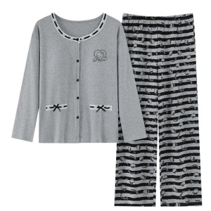带胸垫春秋季睡衣女带胸垫圆领开衫长袖长裤纯棉甜美可爱风家居服