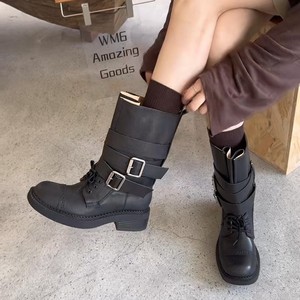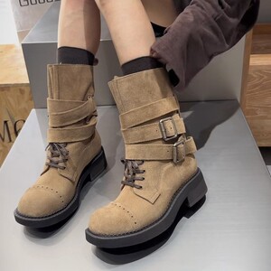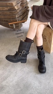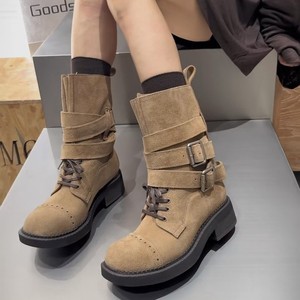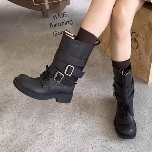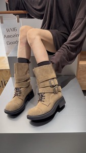 WM6欧洲站女鞋25秋时尚皮带扣小牛皮牛猄皮圆头套筒西部战靴短靴