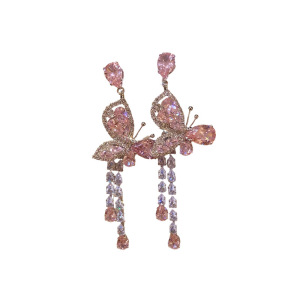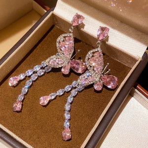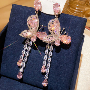 银针粉色锆石蝴蝶水滴流苏耳环轻奢高级感耳坠甜美时尚百搭耳饰女