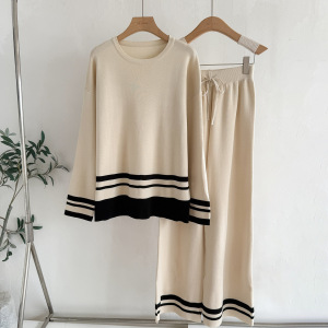 欧美亚马逊跨境外贸女装新款时尚休闲慵懒风针织撞色舒适两件套装