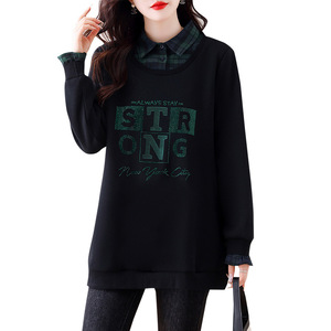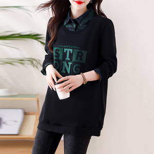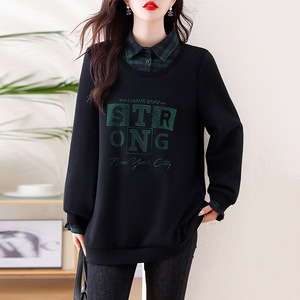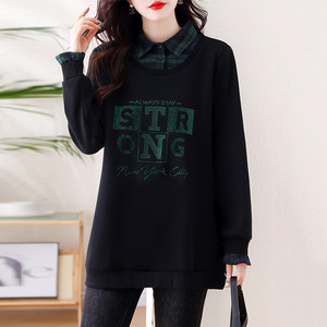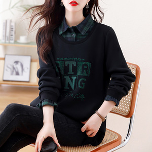 2025春秋季新款加肥加大韩版翻领假两件遮肉格子拼接洋气卫衣女