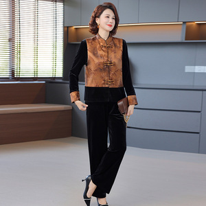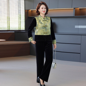 新中式妈妈秋装国风金丝绒三件套2025新款中老年女装马甲外套套装