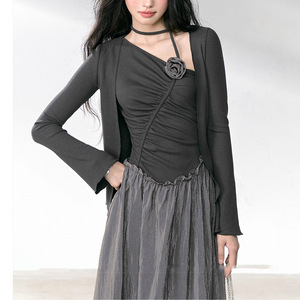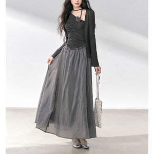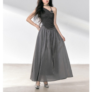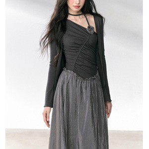 醋酸裙摆不规则斜肩连衣裙秋清冷高ji感显瘦黑色长裙外搭针织衫女