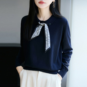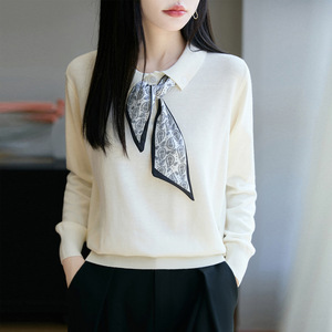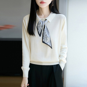 丝巾polo领衬衣长袖女2025秋季新款设计感羊毛针织衫气质上衣