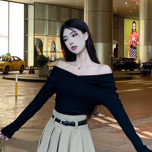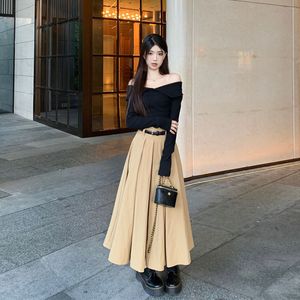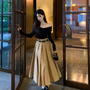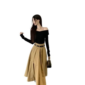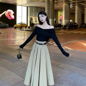 纯欲气质一字肩上衣秋季复古百褶裙半身裙高腰伞裙大摆裙过膝长裙