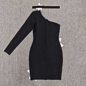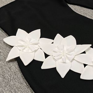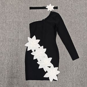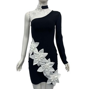 欧美新款女装时尚立体花朵长袖单肩名媛风修身包臀绷带连衣裙礼服