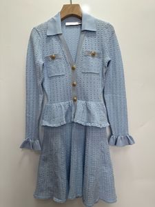 SP2025法式名媛风气质翻领荷叶边收腰喇叭袖钩花针织长袖连衣裙女