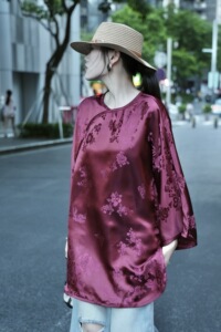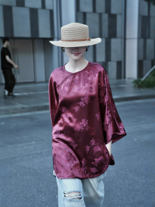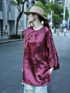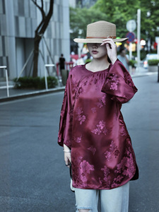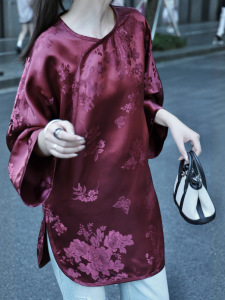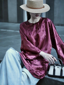 南油批发新款复古酒红老缎休闲贵气中长款上衣衬衫桑蚕丝人丝老缎