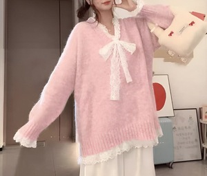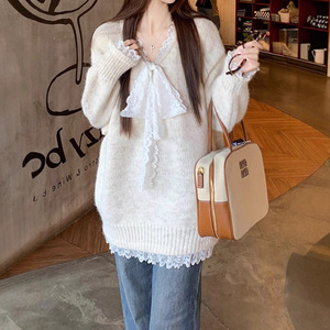 2025早秋小众女装韩系蕾丝拼接百搭打底纯色针织衫套头毛衣女