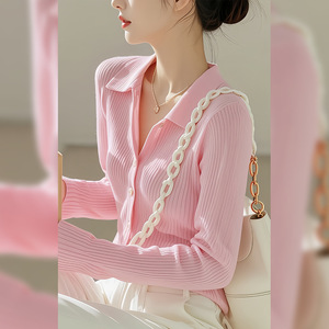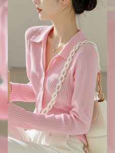 粉色polo领暗纹长袖针织衫2025新款女甜辣秋冬季chic别致洋气上衣