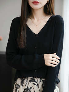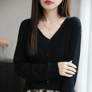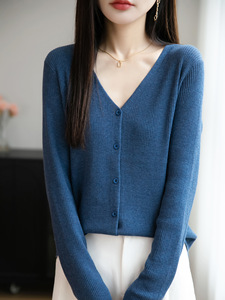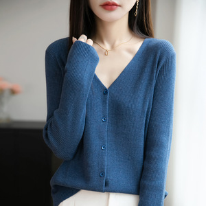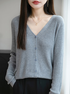 2025年早秋新款精纺羊毛V领针织开衫长袖女纯色坑条宽松百搭上衣