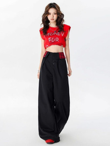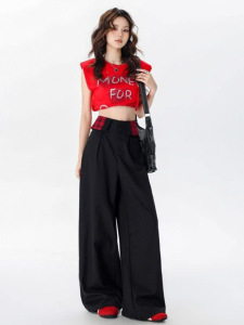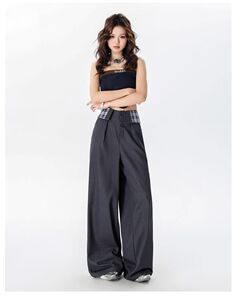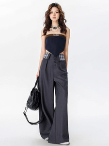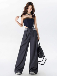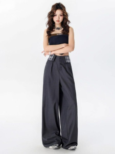 灰色西装裤女2025秋季新款高腰排扣拼接格子休闲长裤宽松bf慵懒风