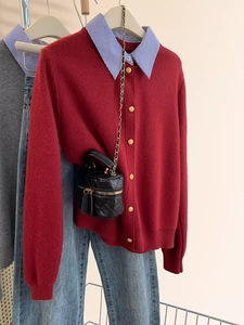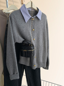 秋冬新款韩版衬衫领拼接纯色百搭宽松时尚休闲假两件针织衫A6730
