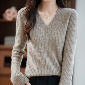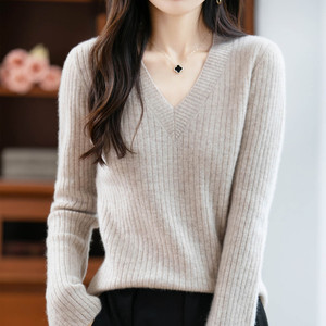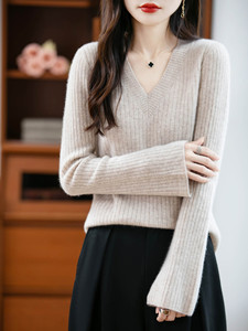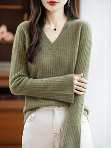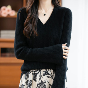 V领喇叭袖设计感羊毛衫女秋冬休闲日常百搭毛衣纯色打底羊毛衫女