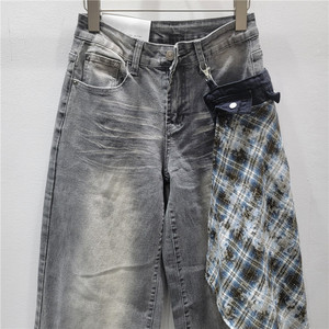 格子拼接美式工装牛仔裤女2025新款宽松显瘦弹力牛仔长裤子