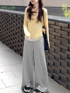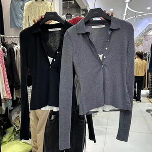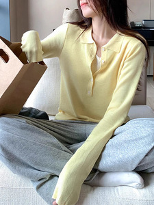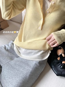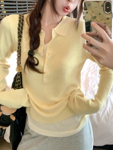 曾小咸黄色polo领假两件拼色长袖针织衫