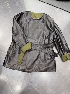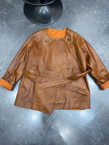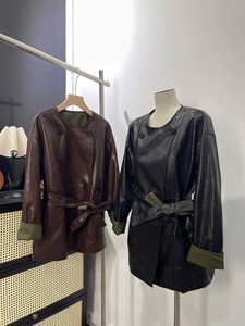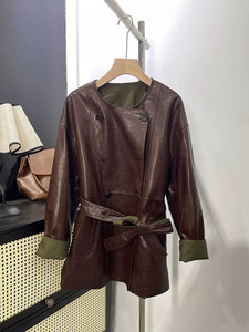 美式复古圆领真皮皮衣外套女中长款2025秋系带油蜡绵羊皮皮夹克潮