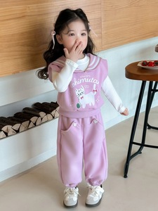 2025春秋新款女童海军领卫衣三件套猫咪卡通刺绣阔腿裤套装洋气