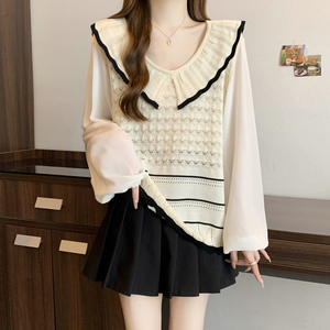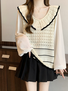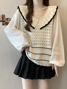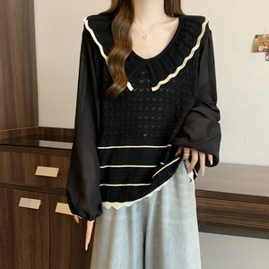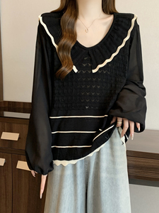 大码洋气娃娃领镂空镂空长袖拼色上衣胖mm设计感显瘦秋季针织衫女