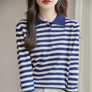 棉线POLO领条纹长袖针织衫T恤女秋季新款毛衣宽松显瘦撞色上衣