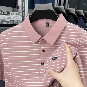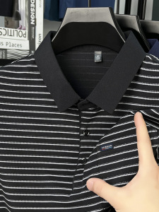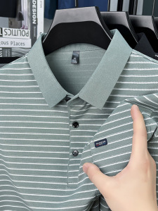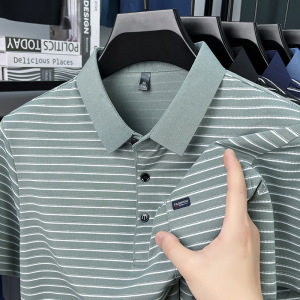 中年男士翻领polo衫春秋百搭宽松休闲透气长袖T恤条纹上衣打底衫