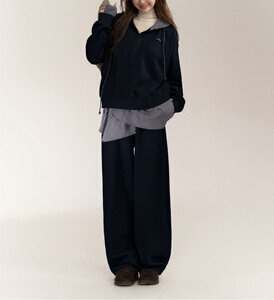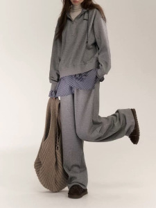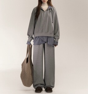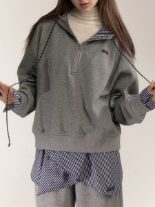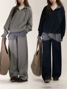 【现货】AsGony美式复古学院风假两件格纹拼接卫衣带屁帘卫裤套装