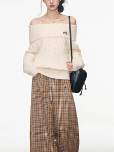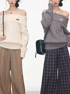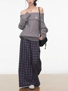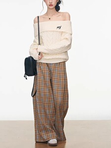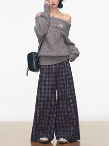 一字肩上衣高级感毛衣套装+垂感格纹裤休闲女