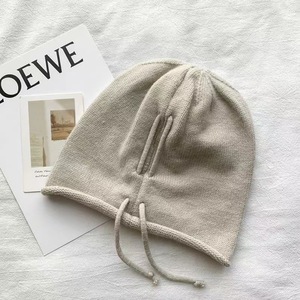 网红堆堆帽女秋冬显脸小包头冷帽大头围护耳抽绳卷边针织毛线帽子