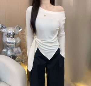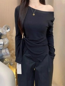 2025早秋新款韩系下摆不规则开叉收腰高级感显瘦百搭斜肩长袖T恤