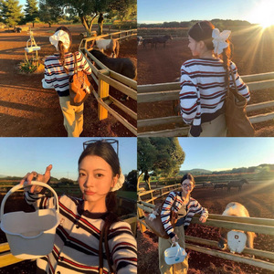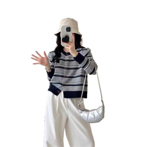 小狗刺绣秋季长袖条纹针织衫圆领开衫女设计感百搭短款上衣女装