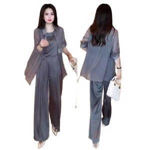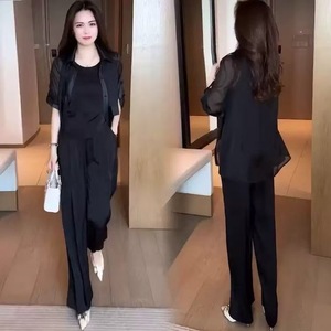 一件代发时尚套装女2025夏季款洋气显瘦防晒衬衫阔腿裤休闲三件套