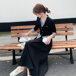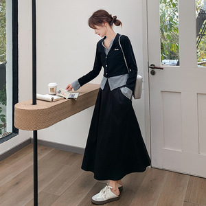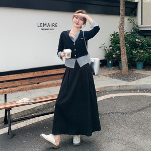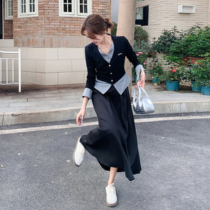 实拍黑色休闲气质假两件上衣套装裙女秋2025新款开衫半身裙两件套
