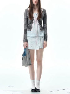复古撞色条纹短开衫女 系带设计修身显瘦长袖衣少女感外套
