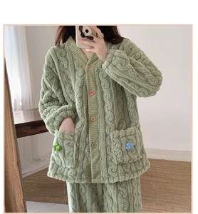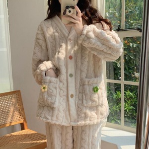 开衫v领睡衣女秋冬加厚加绒甜蜜蜜小花朵家居服珊瑚绒睡衣套装