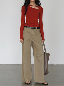 EIGHTMONTH 红色单侧挖空长袖上衣女设计感小众秋季显瘦打底T恤