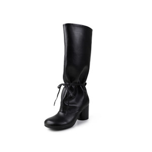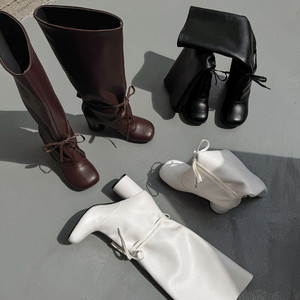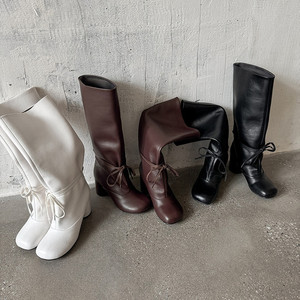二层牛皮系带高筒长靴女骑士靴冬新款真皮圆头粗高跟及膝靴女单靴