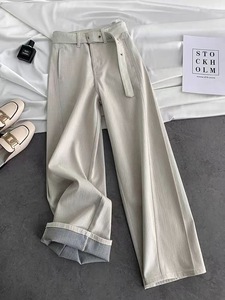 系带高腰阔腿牛仔裤女秋新款复古港风休闲宽松弯刀裤设计感
