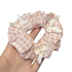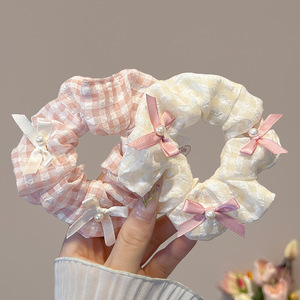 甜美粉白格纹蝴蝶结大肠发圈2025年新款小清新仿珍珠扎头发绳头饰