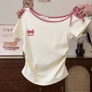 纯欲刺绣格纹蝴蝶结绑带斜肩短袖T恤女夏季甜辣妹收腰短款上衣ins