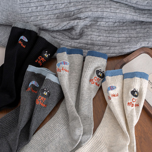 猫吃鱼袜子女小红书同款卡通猫咪刺绣中筒袜韩系堆堆袜不对称袜子